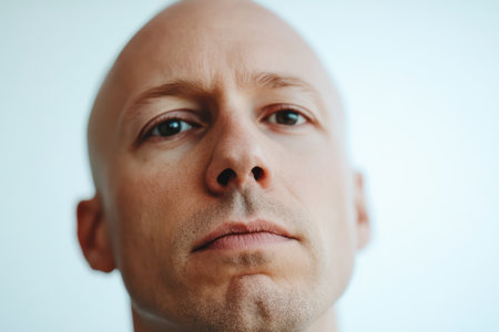 Close-up of man with noticeable hair loss or alopecia, head isolated on white background, showing baldness and condition.