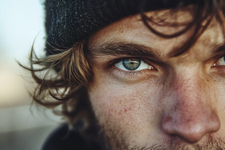 A captivating close-up profile of a man showcasing light blue eyes and intricate skin textures, highlighting emotion and personality in soft natural light.