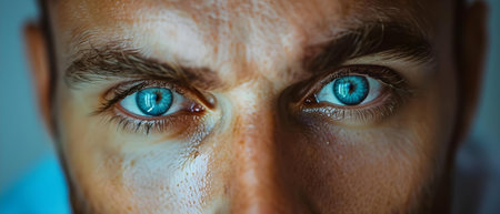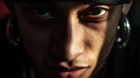 This striking close-up portrait showcases a young man's intense gaze, beautifully highlighting his facial features and intricate shadows. The dramatic lighting enhances the emotion captured, offering a unique perspective on personal expression and individuality.