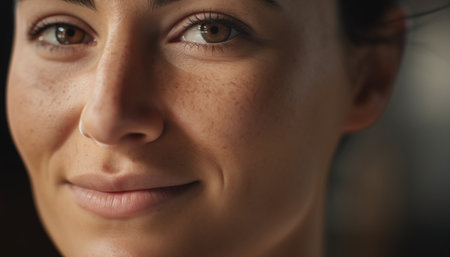 A close up shot of a woman's face with freckles