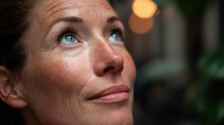 Close-Up Portrait of a Thoughtful Woman Gazing Upward with Soft Natural Light and Warm Bokeh Background Perfect for Inspirational and Lifestyle Imagery