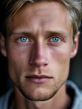 Close-up portrait of a handsome young man with blue eyes.