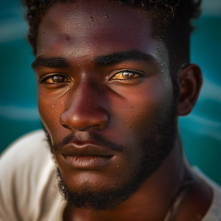 A close-up image capturing the intense expression of a young man with structured features. The shot emphasizes his deep gaze and natural hairstyle, reflecting confidence and a contemplative mood.