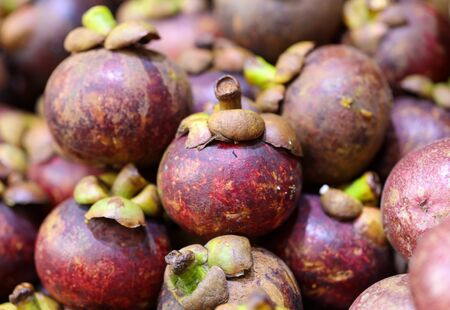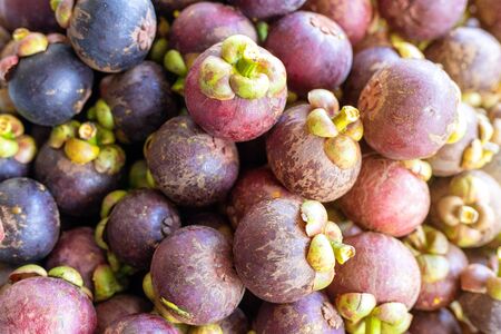 Closeup of Fresh ripe mangosteen fruits for sale in a supermarket and market at Thailand, queen of fruits, mangosteen is a fruit with white flesh, sweet and delicious