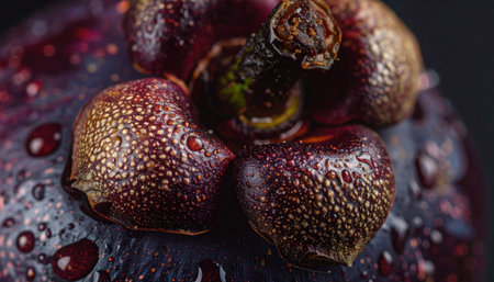 Close-up of fresh Mangosteen with water drops on a pitch solid black background