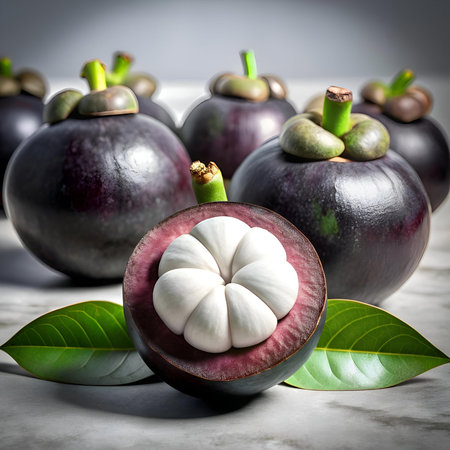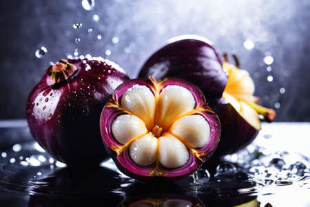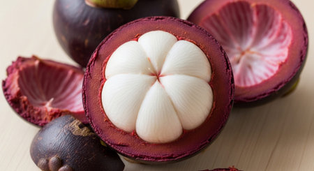 Fresh ripe mangosteen fruits and cross section showing the thick purple skin and white flesh.