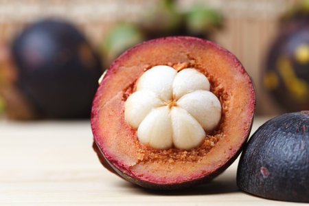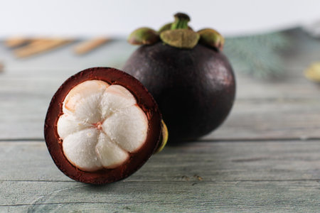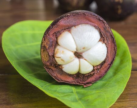 Fresh red and purple mangosteen on wood table. Queen of fruit, good for Anti-anging. Asian local Thai fruit with white fruit after peeling hard shell.