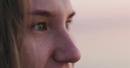 Closeup of teenage girl eye at sunset on a beach, wide photo