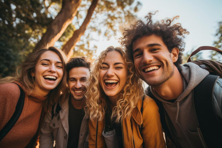 Portrait of four multiracial student friends in winter clothes smiling at camera