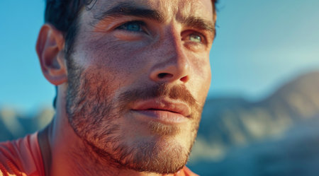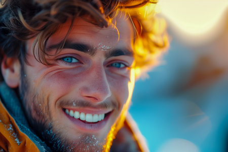 A shallow focus of a smiling handsome young bearded Ukrainian hiker male