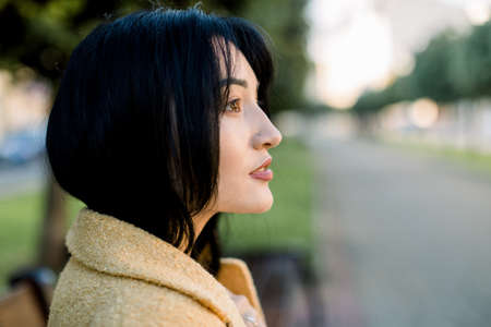 Close up side view of face of charming dreamy Asian urban woman, sitting on a bench of a park and enjoying beautiful morning with sunrise on the background. City lifestyle.