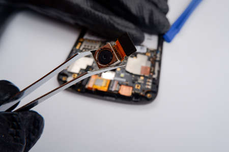 Close-up Of A Technician Hand Repairing Damaged Mobile Phone Camera