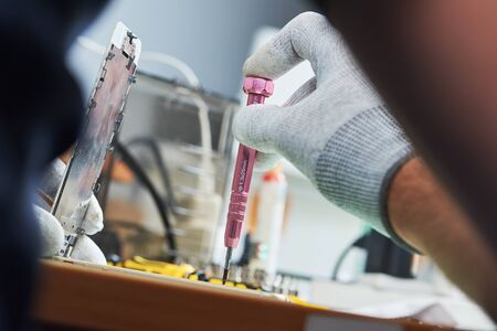 A man is repairing a Smartphone. Hands hold a screwdriver and disconnect the sim card loop. Services Repair. Selective focus.