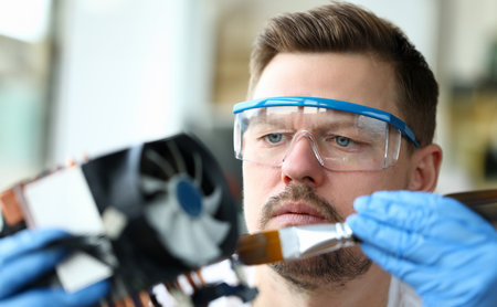 Man repairing CPU board of a computer. IT specialist, fixing hardware. Professional service.
