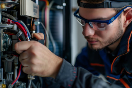 A skilled technician focuses intently on repairing an air conditioning unit in a workshop, showcasing precision and expertise. This image captures the essence of technical maintenance and service.