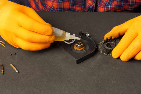 A master technologist makes fans for a computer cooling system. Computer Fan Parts lie on the table