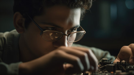 Mechanical Engineer Male Hispanic Young Adult Designing and building mechanical devices and systems in Workshop. Generative AI AIG22.
