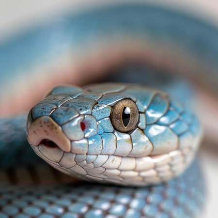 Vibrant blue snake displays striking colors and intricate scales in natural habitat near tropical forest