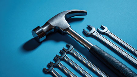 This captivating image showcases a hammer and a set of metal wrenches arranged neatly on a blue background, ideal for construction and repair themes.