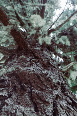 The texture of the trunk of a tall pine against the background of the crown and branches in bokeh. bottom view