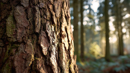 Discover the beauty of nature in this close-up of tree bark, showcasing unique textures and warm light filtered through a tranquil forest setting.