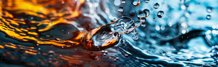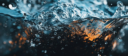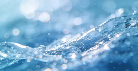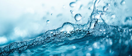Close-up of splashing water droplets in motion, capturing the dynamic and refreshing essence of water in blue hues. High quality photo