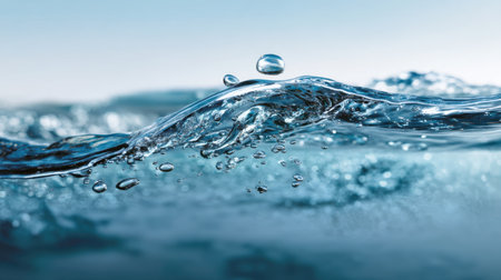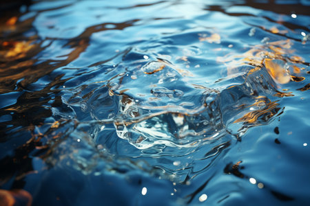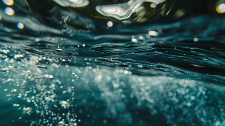 Transparent blue water with ripples and defocused texture, shimmering reflections of light. Calm surface with bubbles and subtle splashes creating beautiful patterns.