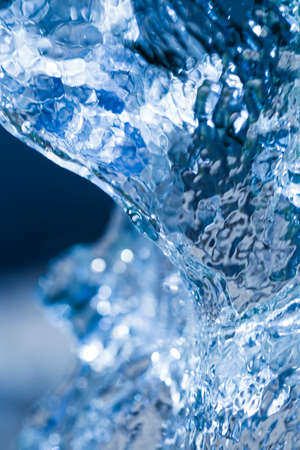 Drops of water close-up macro with a sunlight fall on the heavy splash water surface on a blue background