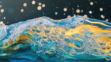 An abstract close-up of water featuring colorful reflections and bubbles, creating a vibrant and dynamic image perfect for creative and artistic themes.