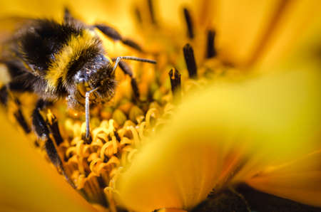 Fluffy bumblebee on juicy yellow flower with orange center and vivid pleasant pure petals. Pollination of beautiful flowering topinambur close-up. Bumblebee collect nectar in inflorescence in macro.