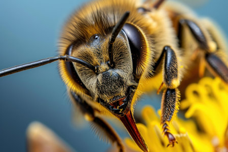 A macro photograph captures a bee in intricate detail as it gathers pollen from a yellow flower. Set on a bright day, the image highlights the beauty of nature and the bees role.