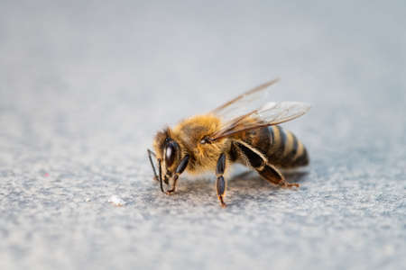 Close-up, wet bee on a marble surface after rain. With space for text.