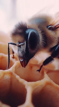 This close-up image showcases a honeybee, highlighting its intricate features and textures. The soft background emphasizes the bee's importance in nature and agriculture.