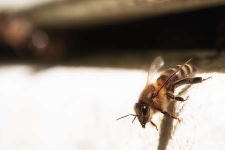 A bee sits at the entrance of the hive. The bright sun creates a copy space. Macro photo of a bee breed Apis mellifera carnica close up. Blank for advertising beekeeping products.