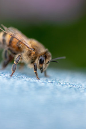 Bee on a rusty metal surface. Macro photo with shallow depth of field.