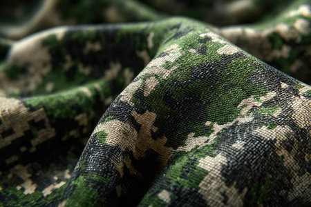 An intricate textile showcasing a finely detailed digital motif in shades of forest green, charcoal, and sandy beige, ideal for tactical gear or modern urban apparel.