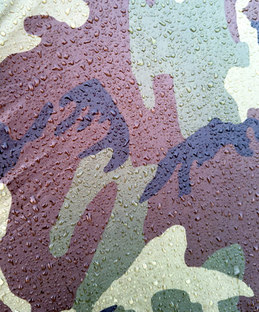 A wet camo print with water droplets on it. The water droplets are scattered all over the print, giving it a sense of movement and life. The print is a mix of green and brown colors