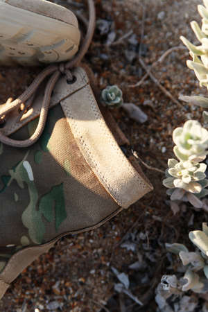 Beige army military boots with laces against the mountains in the beginning of a sunny day. Caucasus, Russia