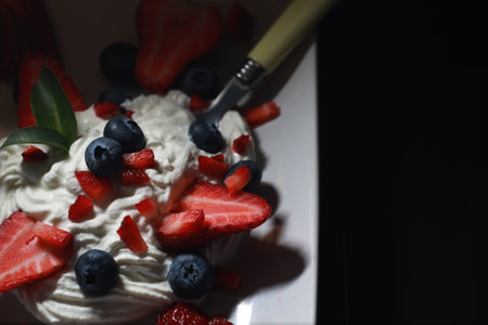 Fresh juicy red strawberries and blueberries in heavy whipped cream close-up