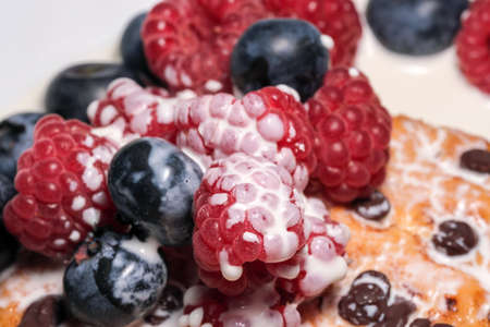Mix of sweet berries with cream and cookies with chocolate close-up macro photography