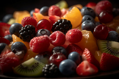 A plate of a fruit salad with berries and mint on it, AI