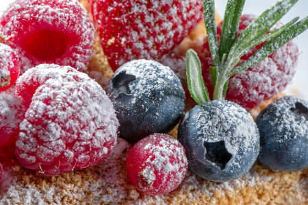 fresh raspberries, cranberries, blueberries and strawberry sprinkled with icing sugar close-up on fruit cake top with rosemary leaves against white background