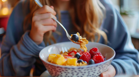 women eating a bowl of fruit for breakfast generative ai