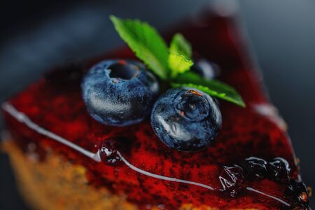 Dark beer chocolate cake on white plate and decorated with strawberries, blueberries and pistachio on wooden table.