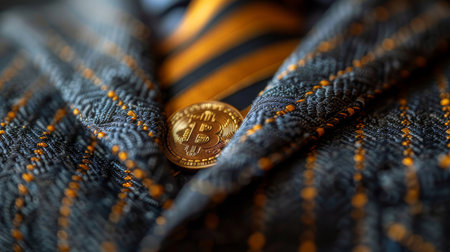 Detailed close-up of a Bitcoin coin in the pocket of a suit, symbolizing business and cryptocurrency.