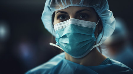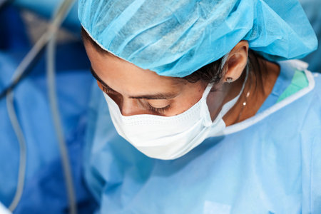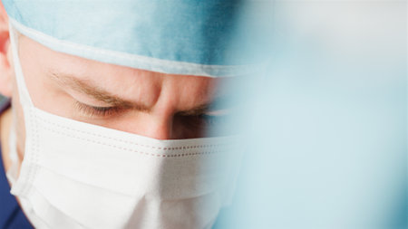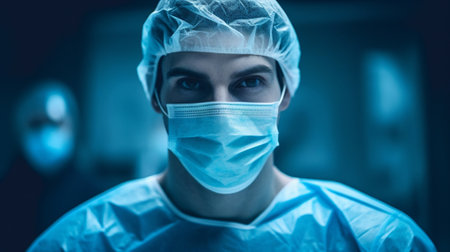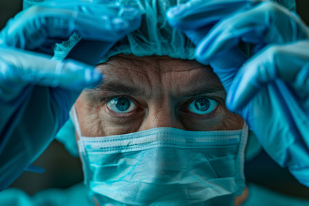A surgeon concentrates intently in the operating room, wearing a mask and a cap, as they prepare for a crucial surgery, ensuring patient safety and care.