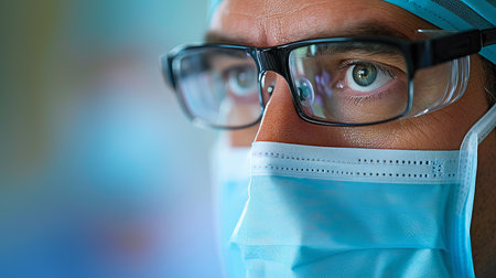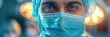 A close-up of a focused surgeon wearing a surgical mask, preparing for surgery in a modern operating room. The image conveys professionalism, healthcare, and medical precision.