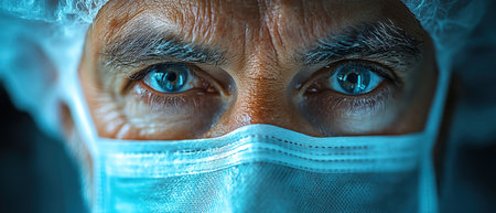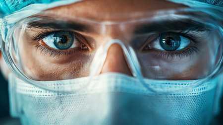 Close-up of a surgeon's focused gaze, framed by sterile blue gloves and a surgical mask. A close-up of a medical professional's eyes, framed by a face mask and surgical gloves.