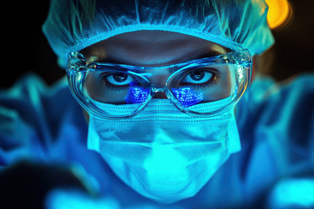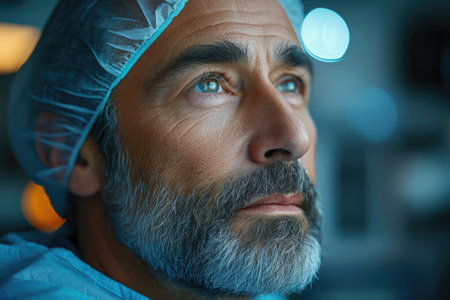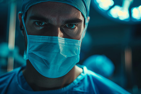 Surgeons intense gaze, closeup, bluetinged operating room, focused overhead lighting