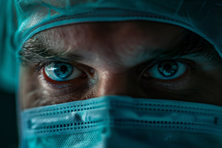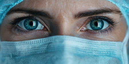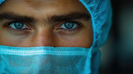 A dedicated healthcare worker with vivid blue eyes, clad in a surgical cap and mask, concentrating intensely on a critical procedure in a sterile clinical setting.